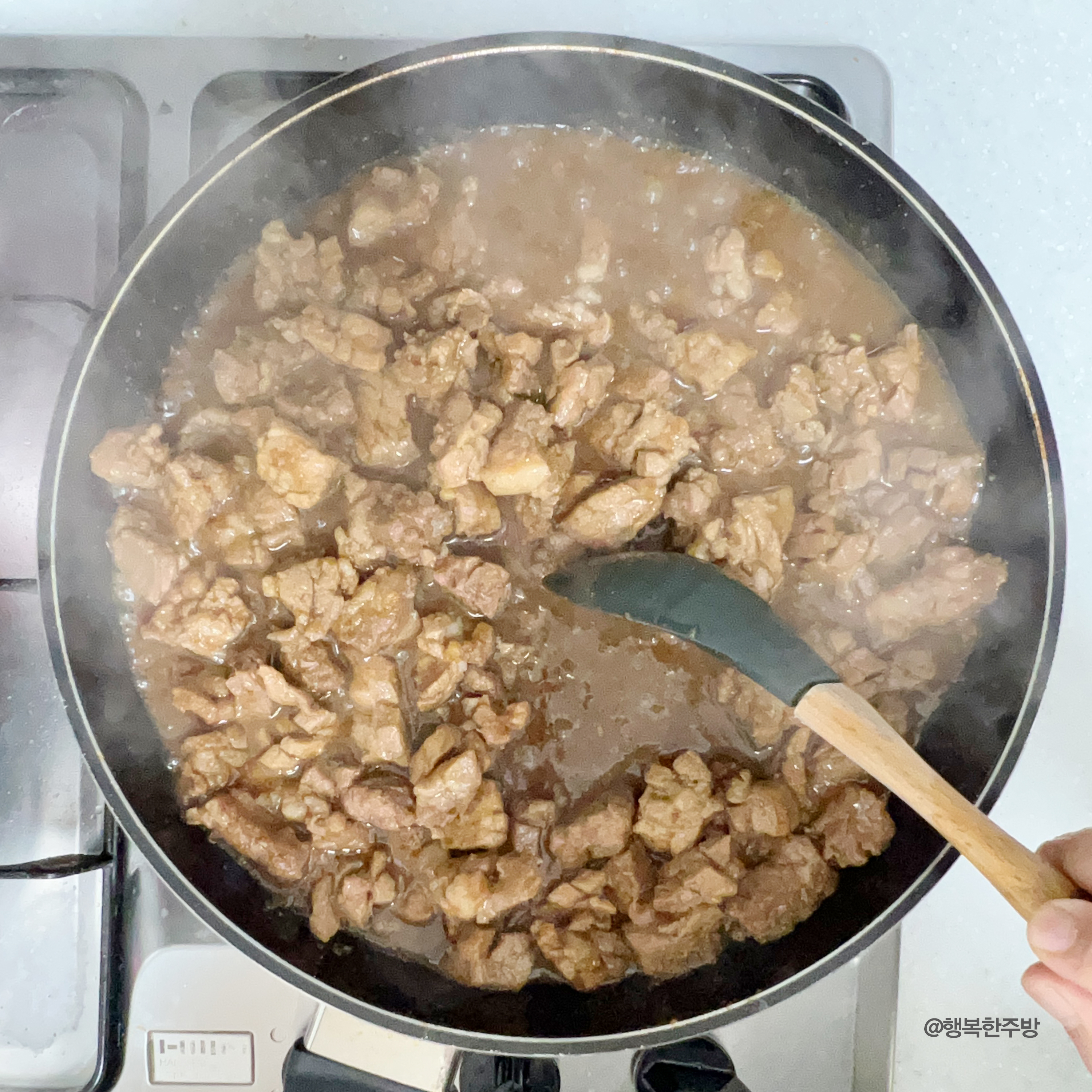 숯을 이용해 석쇠에 구워내면 더욱 맛있겠지만 가정집에서는 쉽지 않기 때문에 프라이팬을 이용해 구워볼게요. 코팅팬을 사용하면 고기요리를 할 때 눌어붙지 않아 요리하기 훨씬 편해요. 👉 제가 사용하는 프라이팬 제품은 아래 링크에서 확인하실 수 있어요. (https://link.coupang.com/a/d9pqOl) 달군 팬에 양념 넉넉히 넣어 고기를 앞뒤로 구워요 적당히 익은 고기는 먹기 좋은 크기로 잘라주고요. 양념이 고기에 쏙 베이고 졸아들도록 중불에서 졸여주면 완성이에요. 바싹 졸인 돼지고기는 불맛도 살짝 나고 아주 맛있답니다.
