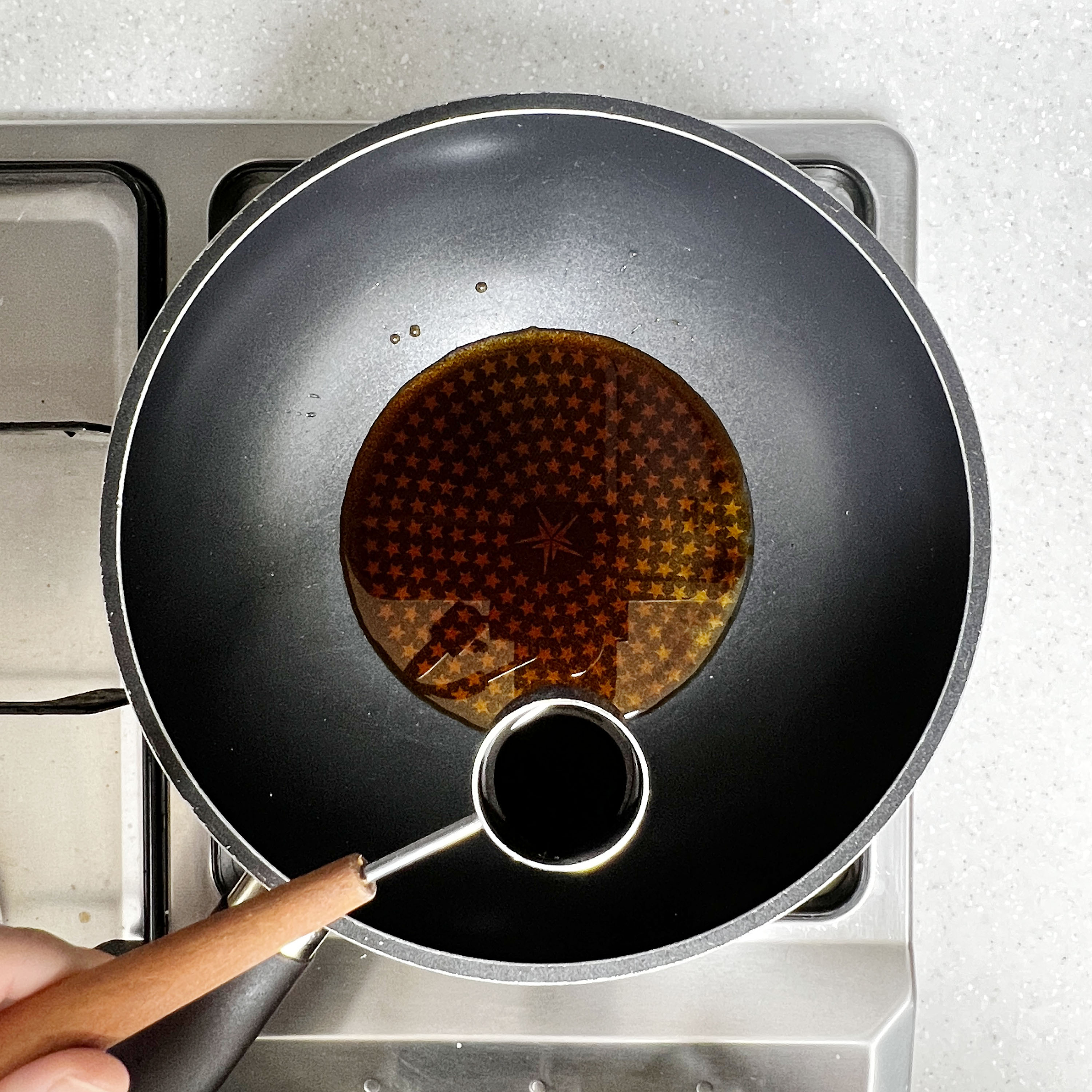 넓은 팬에 맛술 3큰술, 간장 2큰술, 물엿 2큰술, 설탕 1큰술, 다진 마늘 1큰술, 마지막으로 고추창 1 티스푼을 넣고 잘 섞어 양념장을 끓여요